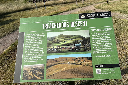 Read moreI am following different sections of the Oregon Trail in Kansas, Nebraska and Wyoming. This legendery spot is a must stop if you are interested in the challenging journey of the emigrants to California and Oregon. Windlass Hill is a turnoff south of the Ash Hollow State Historical Park entrance. The parking lot has an informative display and signs pointing to Oregon and California. It was quite a steep climb on a concrete path up the hill to the top. There were benches toward the top of the hill. There is a grand view of the surrounding area and you can also see the old wagon ruts embedded into the hill. It must have been terrifying for the pioneers trying to keep their heavy wagons and the animals pulling them from careening too quickly down the hill and crashing at the bottom. From the book, The Oregon Trail Revisited, author Gregory Franzwa described the descent, "Riders led their horses, wheels were locked and chained, front wheel to back wheel. Two mules were crushed when one wagon escaped even...