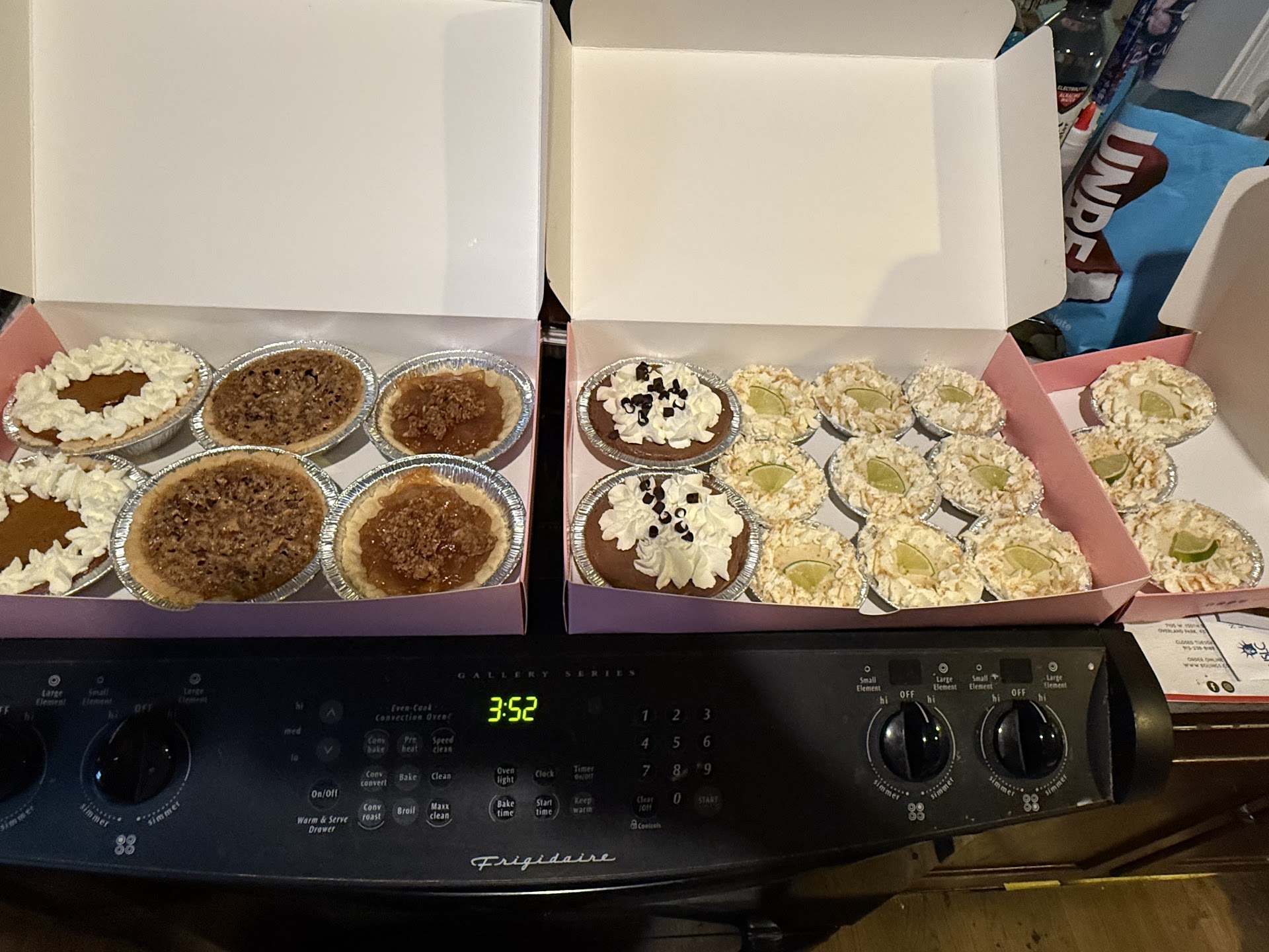 I was upset that they ran out of my key lime pies since I had pre-ordered it 2 days early. And 3 minis isnāt the same as 1 regular pies. So other people that weee walk inās before my pick up time were able to get the regular sized key lime pies but I was not able to for my pre-order.
