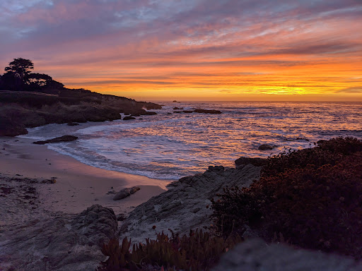 This is an amazing stop on the 17 mile drive. The rocks in the front generate strong splashes of waves. There are stairs to the beach below and this sand was yellowish instead of the white one I had become used to in Monterey-Carmel. Tiny colourful flowers are abundant in the area. On the opposite side you'll see beautiful private golf courses and gigantic cypress trees. I could feel the richness of the area. Would be great to settle down...