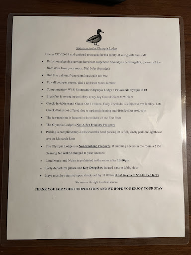 Read moreI would strongly advise AGAINST staying at Olympia lodge. No staff on site, except for very limited hours means you are calling numbers to get your keys out of lock boxes. The room has a locking sliding glass door vs. a normal door that was incredibly sticky and heavy to slide open. There were no curtains but rather wooden slabs that slid on runners that were heavy and hard to move and did not give the darkness that curtains do. The bathroom door in the room did not close properly and did not lock at all. There was a fridge in the room that ran very loudly with with a loud popping noise every time it came on, waking me up several times during the night. The thermostat in the room was installed upside down, so not even sure how to control the temperature. There was only one small bar of soap provided by the sink and liquid dispensers of lesser quality shampoo/conditioner and soap in the shower. The in room coffee provided was TERRIBLE tasking and the single serve coffee maker did not get the coffee water very hot. I have never seen a property rated over 3 stars that was this BAD. It is about a 2 star property at best...and that is being generous. The room had water stains on the ceiling. The grab and go breakfast offered with the room could only be picked up between 8-9AM, so not terribly flexible with that. There are so so many other options in the area that seemed much better for less money. GO ELSEWHERE and do not make the same mistake I did in choosing Olympia Lodge. Due to covid there was no servicing of the room, which is understood, but the lack of someone even in the office mean there was no one for questions, getting or turning in keys, or for breakfast pick up if one was getting an early of late...