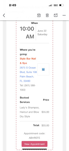 Read moreWorse pedicure and overall experience I’ve had at a nail salon. When booking an appointment woman who answered was extremely rude. When my friend and I walked into no other nail customers were there and the staff with children were staring out the window for our arrival. Once we got there the children were instructed go outside, but then came in after my service (very strange and was described on other comments as very unprofessional). I got my pedicure done, but my friend ended up not getting the manicure requested as they didn’t choose to service us at the same time. The whole point on going together is to get it done at the same time so no one is waiting. Next, when I chose a color I was handed the gel nail color choices which is not what I requested. Then, the blue I chose on the wheel was not what was not used. Poor quality polish. My appointment was suppose to be for 45 min and ended on about 20 min. Knock off bags and other products were being promoted. When asked to pay she was pushy about receiving cash and up charge for card transactions as well as very demanding for a tip (not classy). Worst of all my friends saw the salons license that was displayed expired. My last comment is when my nails were clipped they were butchered and cut to the nub where it hurts and looks really bad. Save yourself time and energy and...