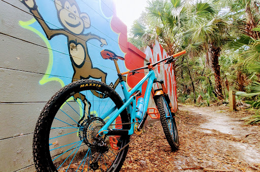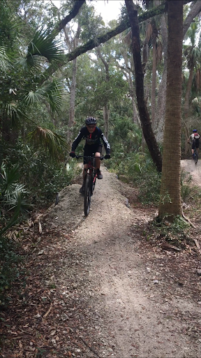 The Blue Trail- very flat, with minimal elevation change and just a few spots where a true beginner might need to walk the bike around an obstacle. It's a good trail to take the kids, rolls through some pretty saw palm, and it's well shaded. Calling it intermediate is a stretch, but it does offer a place to ride for newer folks or those want a relaxing ride.