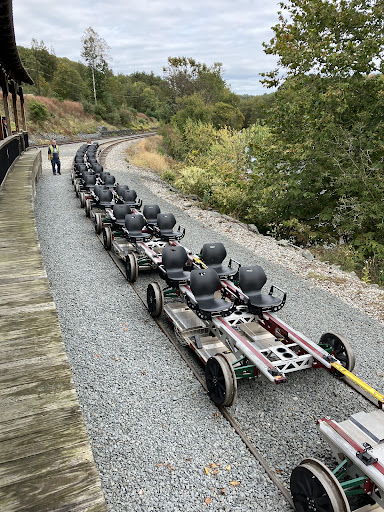 Went in late September and loved it. The leaves were just turning along the trail. 5 miles out, 5 miles back. Some things to know and tips: BRING A CUSHION FOR YOUR lower BACK! The seats are hard plastic and your lower back can get very sore. Show up at least 15 minutes before and check in at the blue tent. Portable toilets are on sight in the parking lot. Bottled water was for sale $1. 3.Matt and his crew were very informative. The bikes hold 2 or 4 people and you will be assigned to a bike. The bikes are human powered as well as an electric motor backup. You sit side by side and the RIGHT SIDE SEAT controls the electric motor gas pedal so, choose who you want to have that responsibility ahead of time. There are 3-4 cup holders in between the two seats and a wire 12âx12â basket for storage. There are âguide bikesâ at the front and back of the train. Bike workers operate and ride on these throughout the trip. The trip is 5 miles out and 5 back for a total 10 mile trip. You will see the same things and be riding on the exact same trail when returning. The bikes will ALL be attached at first until we all cross over 3 streets. At that point the guides will â detachâ the cars from each other and, you will be free to begin pedaling or using the electric motor pedal, keeping a safe distance from the bike in front of you. You can ride at your own pace and there is no required distance you must stay behind or ahead of the other bikes but, a steady pace is necessary. The guides will instruct you to all wave your arm in the air should the need to slow down arise. This warns everyone behind you to slow down. A raised arm with a solid fist by the guides means there is a need to STOP. A cable running down the center of the bike and within arms reach while sitting is used as a breaking mechanism. Youâll want to familiarize yourself with just how hard youâll need to pull up to stop the bike ahead of time. The seating will be adjusted and locked down by the guides before the bikes move once. Everyone must be comfortable and the pedals must spin freely to avoid having your feet or legs injured. We did see 2 Eagles on the ride as well as old remains of years gone by along the tracks. The entire process is reversed once you reach the 5 mile stop with the guides switching the seat around as well as the need to adjust the seat distance just like at the beginning. The ride back will probably require the electric motor pedal use as most legs may be tired. Again, the electric motor pedal is on THE RIGHT SIDE and will be operated by the person occupying the RIGHT SIDE SEAT. The entire trip is 2 hours so plan accordingly. Remember that you will be exercising while pedaling and to dress...
