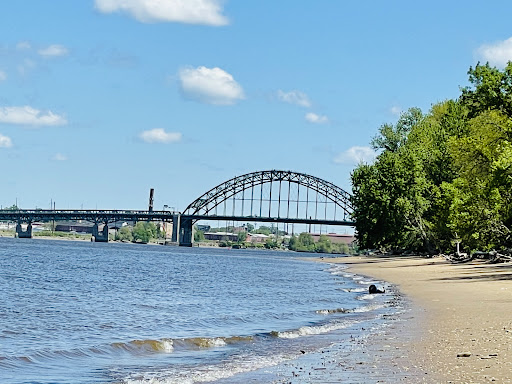 When I started walking, I enjoyed the nice views of the Delaware River, bridges and park at such a pleasant sunny day. There are lots of access to the river from the trail. You can walk at the sandy shore at low tide time but must watch out as the tide fills up very quickly. This morning before noontime, I was able to walk on the riverside toward another bridge. But when I came back, the sandy walkable edge of the river was filled up with water already. However, I would suggest that you wear shoes to walk on the shore any time as there‘s too much junk washed onshore, you never know what you would step onto.