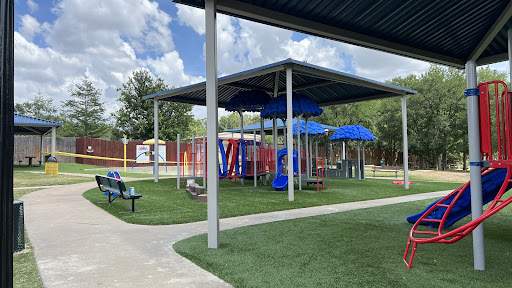 Fun little park that was recently renovated (2024). Love that the ground cover is a fake grass instead of wood chips or sand. The play structures are covered which is awesome in the TX sun and needs to be standard for all playgrounds, honestly! There are plenty of climbing opportunities, musical instruments, a push-style merry go round, and several slides. We have been to this park probably five times this summer and have seen a wide range of kid ages playing here and they all have a blast.