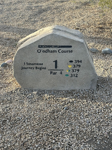 We played the O'Odham course and it was by far the worst course we played on this trip. There was no rough to speak of so the fairways fell off into unmaintained desert where there were prairie dog holes all over the place. Worse yet, much of the desert was lined with ropes for no apparent reason that you have to duck under to get to your ball. The course was almost perfectly flat except for the fact that the fairways were slightly elevated above the desert so any ball heading down the edge of fairways would slide off into the prairie dog holes. There were no water hazards or scenery of any sort on this course.
