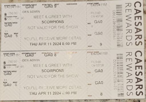 First of all, if you ever use Ticketmaster to purchase anything like this, BEWARE!!!!! The verbiage on their website is extremely ambiguous, misleading and confusing when purchasing tickets on it. Here’s my experience: in November of 2023, I purchased (2) “Meet & Greet” tickets for the April 11th, 2024 Scorpions event in Las Vegas. In case you don’t know, if you wish to go to the actual concert, you must purchase separate tickets for that, from the Meet & Greet tickets. I spent $1,805 for what I thought was Meet & Greet AND the concert. As you can see on pic of my purchase receipt, it indicates that I have purchased (2) tickets in the General Admission section, right in front of the stage. To me, that’s a very clear message that I had seats at the concert. Super! I thought all was taken care of. Being that I live out of state, I paid for a hotel room and airfare to Vegas, as well as incidentals such as transportation while in Vegas and meals, etc., in addition to the $1,805 I already spent for the damned tickets. Only 24 hours before the concert, I get an email telling me the rules about the Meet & Greet; very strict guildelines which boiled down to this: in a span of 1/2 hour, you get (1) photo taken with the band, that's it. No shaking hands, no autograph of a personal item, nothing else. 1 picture for $1,805. Now, here’s the fun part: three hours before the Meet & Greet, I go pick up the tickets, which have actual seat numbers on each ticket, as you can see in the picture. Just below the seat numbers, it indicates that the tickets are not valid for admission to the show itself. When I asked to confirm that I had admission to the actual concert, I’m told by the tall girl with the nose ring, "umm, I think so". I said I wanted confirmation, and was then told “No”. WHAT?????? Ticketmaster indicates on their website, that this “add-on” cannot be purchased without event tickets, i.e. admission to the concert, so how was I able to do just that? I’m then told that there were a few General Admission tickets left, and if I wanted to, I could purchase (2) for an additional $375. And to find all of this out a mere 3 hours before the event was horrifying! I was devastated by all of this! There was NO WAY I was going to shell out another penny for what I considered to be a once-in-a-lifetime opportunity The only positive thing to come out of this was that Ticketmaster did give me a refund since, thankfully, I called them prior to the event to request it. So, after all this, I never did see the Scorpions concert, nor did I go to the Meet & Greet. My advice: DON’T USE TICKETMASTER TO PURCHASE EVENT TICKETS!!!!! And Bakkt Theater, hire people who know what...