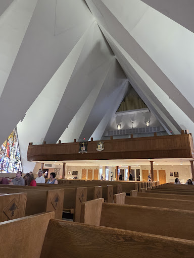 It appears that lighting is designed to illuminate the altar, the mural, and the distracting suspended crucifix which is a copy of the crucifix in Holy Name Cathedral in Chicago. There were no lights to illuminate the nave. We couldn't read thd worship aids to participste fully; we can't imagine what it's like in darker winter months.