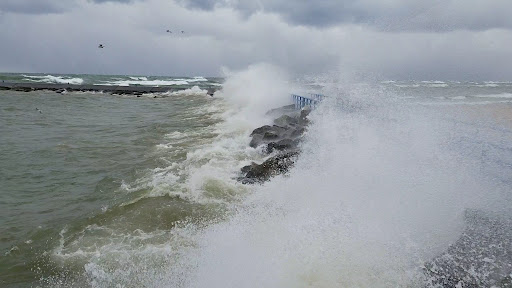 Read moreWind & waves were great on 11-17-2022. We watched the sand bars do their job to break down the waves coming onshore to the beach. The waves coming in from the lake and entering the harbor are reduced to about 3' to 3.5' by the harbor mouth profile and they break impressively against the rocks protecting the pier jetties. The waves that were reaching into the channel had a nice roll over the edge of the channel wall as shown. The wind direction allowed us to stand comfortably behind the NOAA weather station.