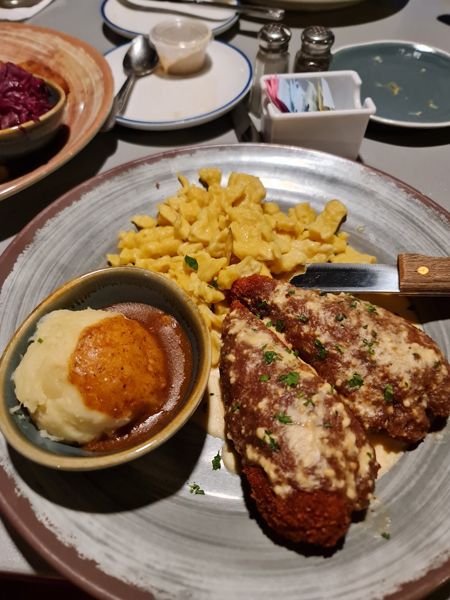 When we got in the car my friend's father said that he definitely had enough German food for the foreseeable future, and the mom commented that the next time we'd go somewhere else after such bad service. I don't say this as a threat because I think the "we'll take our business elsewhere" threat kind of empty on these reviews, but know that I'm from out of town, and all my party had been building up excitement for this dinner for a few days, and then pretty much the whole party was fully disappointed in the experience last night. And I say that out of guilt because the staff all seemed like cool people I'd like to hang out with otherwise, but if they were in charge of my business, I'd have some angry conversations with them after that unacceptable (FRIDAY NIGHT!) dinner...