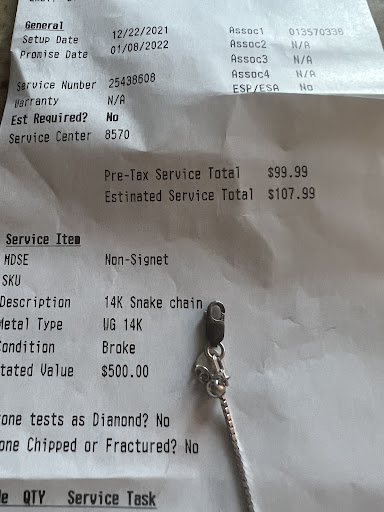 Right now due to all the renovating they are doing this Kay location is very desperate for sales. They will admit that which is very unprofessional. The two times we had gone there (within a week) the guy working there told us the same story. That they were allowed to mark down items and blah blah blah and that guy (a customer that was there before us) was his "best customer" and he just walked out with this and that for this much. Just very unprofessional and obvious that's a line he uses often. The older woman there admitted they almost didn't pass an audit they had earlier in the day. Who says that to customers? I will not be going back to this location. I only went to see some rings I saw online in person, and when I couldn't find one I liked, I ordered online and had it delivered to that store. Which I got an attitude about why I didn't purchase in store, well, they didn't have that specific ring. They said they could have ordered it for me, and get commission. Also, when I had purchased online, my Kay card was still in my maiden name. After a long discussion they told me the only option I have is to bring my marriage license in with me to pick it up or to cancel my order. When I went to go pick it up, they didn't even ask for my marriage license....