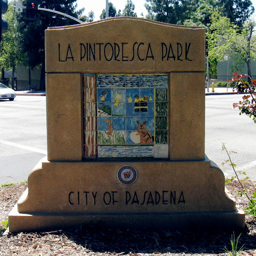 La Pintoresca Park is a public park built in 1925 to a design by Ralph D. Cornell & Theodore Payne, incorporating features from the grounds of an 1888 hotel that formerly occupied the site (the Painter Hotel – later renamed La Pintoresca Hotel - perimeter retaining wall, steps and many of the mature trees on the site). The park includes large areas of lawn, mature trees, a perimeter rock retaining wall and steps, play areas, a tennis court and a skate park. Buildings on the park site include a public library, two power substations (one of which has been converted to an educational use) and a former fire station, also converted to educational use. The park also has a pergola, constructed in 2003, in roughly the center, which is a new design referencing an original pergola that was in the same location.