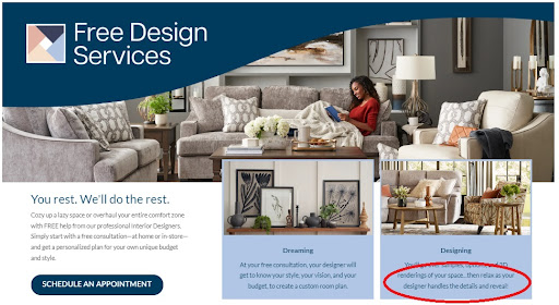 So, we thought we were prepared for the designer costs during our next visit to the store to see the design of our new living room and dining room. But, the quoted amount was not 2-3 times the cost of the furniture, the designer quote was 4 times the cost of the furniture. They don’t tell you, you don’t have to purchase all the little decor items if you don’t want to pay $300 for a shell bowl. We did say no to a few things but bought most of the designer items and paid designer prices because we were supposed to have a designer assist with the delivery and arrangement of furniture and decorative items. The website says, “relax as your designer handles the details and reveal” (see below photo from website). We never saw the designer again.