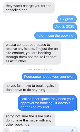 I had a booking at Blah Blah Gallery for August 2 , 2025 for my Pop Event . Which Megan was very much aware of . She cancels my event without speaking with me on Tuesday . However , I was reaching out to this Women before August and asking questions and making sure we are all on the same page . She never mention Vendor insurance until I asked her about the access code to her Gallery. She contact me With all different types of Messages avoiding my question. So she canceled my booking , didn’t have a legit reason avoid responsibility, and this issue makes me believe people are so disrespectful and unprofessional. In addition, she doesn’t communicate accurately on Peerspace or text , she avoids the issue, and waste people’s time. Never book with her she...