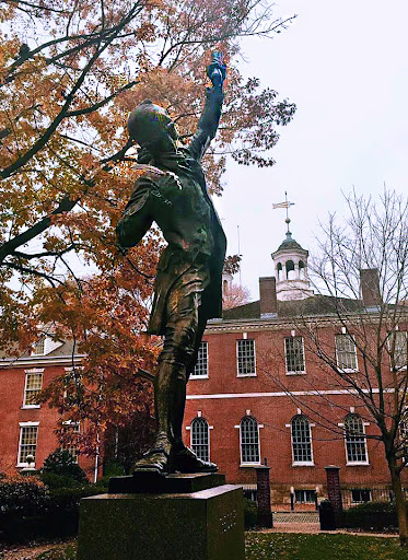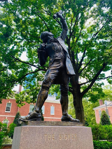 Signer’s Garden, located in Independence National Historical Park, features a bronze sculpture of The Signer by EvAngelos W. Frudakis. The bronze statue of George Clymer, a colornial-styled figure, holds a quill pen in one hand and a scroll in the other. While standing on the solid granite base, he looks and points toward the sky. It honors the signers of The Declaration of Independence, their strength, bravery, and dreams for a new nation. While created in 1980, the statue was unveiled at Independence National Historical Park in 1982 to celebrate Philadelphia's 300th anniversary.