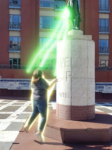 This courtyard once held the Slate Roof House belonging to William Penn and his descendants. The house was destroyed despite protests during the mid-19th century, and the current park was designed by Venturi, Scott Brown, and Associates in 1982. A small model of Slate Roof House stands on one side of the park, while a statue of William Penn stands at the center. These sculptures were briefly the subject of controversy, as the National Park Service released plans that implied the model and statue would be removed for America250 renovations, although the plans has been retracted. Other artworks in the space include a timeline on a neighboring building shows the life of William Penn and events during his lifetime with emphasis on Penn’s dedication to religious freedom, while a mural declaring the area “Welcome Park” was painted on a low wall perpendicular to the building. I hope the future park incorporates the diverse viewpoints of Philadelphians while telling this...