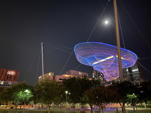 As for the park's amenities, there are none. There's an art piece that looks like a flying, glowing cervix, which is unintentional (it's a prickly pear flower when viewed from above but you're not flying at the park most likely) but cool looking still. There's a little water pad, but I've never seen anyone use it. Otherwise, it's just a giant median with some grass. There is not much shade or shaded seating. The design doesn't encourage people to spend much time there unless they're spending money.