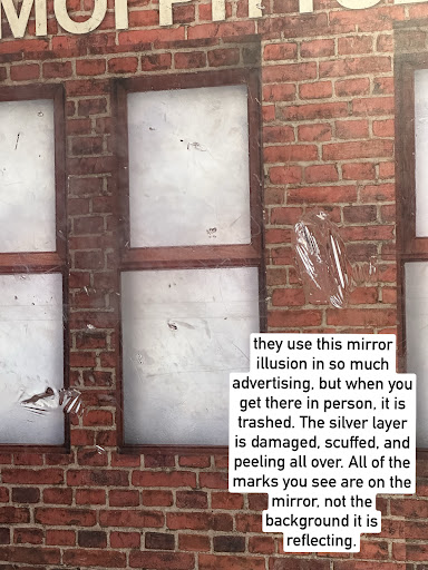 3.) poorly-maintained- this is ultimately why I spent the time to take pics and write this review. This museum is tiny and you can tell they have very little overhead. There is damage, wear, and missing information all over the place, and at $25 a ticket for such a tiny place, this is simply inexcusable. You have ONE job, to have exhibitions, and you can’t even keep them in good repair? Embarrassing, especially when half of them are just a big poster. The back wall is just those wooden puzzles you can get at any dept store around Christmas, and some of them are missing their info cards, rendering them useless. The building wall illusion is ruined by the fact that the mirror is peeling and covered in scuffs and damage. The infinity well is covered in scratches. They conveniently hide ALL of this in their ads and imagery.