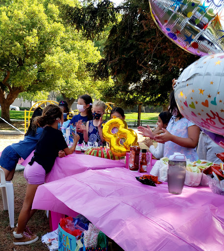 Read moreBrought my friend to the park for a 8 year olds birthday party. It turned out to be less smoky, not as hot, with a cool breese. They had decorated in pink with nice snacks cupcake and lots of drinks. The party was fun for everly one. This park is really nice with lots of grass, many areas for soccer and baseball, a tot yard for up to 5 yo and the bigger yard for older kids. The medium is soft chips under the equipment. The walkways are asphalt winding throughout the park,, easy for bikes and strollers. No problems with ducks/geese because there are no water areas. There is lots of shaded areas under tall redwoods and other trees. Near the front portion there are covered tables. You can bring your own chairs and tables for other shady areas. This park is well taken care of and cleaned, well maintained also many garbage cans, plus a clean large bathroom in the middle...