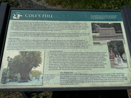 Cole's Hill is a National Historic Landmark containing the first cemetery used by the Mayflower Pilgrims in Plymouth, Massachusetts in 1620. The hill is located on Carver Street near the foot of Leyden Street and across the street from Plymouth Rock.