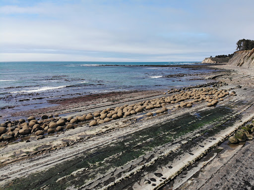 We parked at the trail head to go see the "bowling balls" read the sign about them went and hiked down the muddy steep hill and found nothing. Went back up and then went to the far trail facing the ocean to the right and walked aways unitl it started to go straight down to the beach. Looked for the "bowling balls" and saw nothing so decided to leave. Now that I'm back on google maps I can see if we hiked down the hillside and walked far right we would have gotten to see the so called "bowling balls" I guess next trip we will have to make the trek down the steep terrain to see them:) Don't make our mistake and think where the sign is that is where the bowling balls are:) Other than that the beach was...