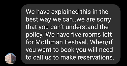 Read moreI wanted so badly to love this place, but I can't even like it. We just left a night early from staying there for The Mothman Festival.