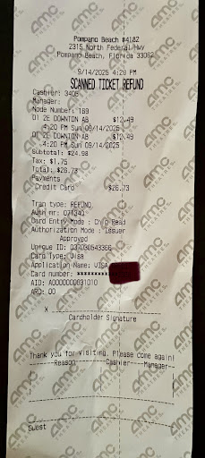 When I first started coming here this movie theater was a Muvico which opened in 1998. The movie theater had a 50's theme with replicas of 50's cars. At the time everything was nice and new. As the years went on things started to look worn and I gravitated towards the AMC chain which had $5 Tuesday movie tickets and reclining seats. I eventually stopped going and was surprised when someone told me it was now an AMC. My daughter was down and we hadn't gotten together in awhile so we hadn't had the chance to see Avengers: Endgame. We were probably the last people on earth to see it. The AMC Pompano was the only theater we could still find it playing at.