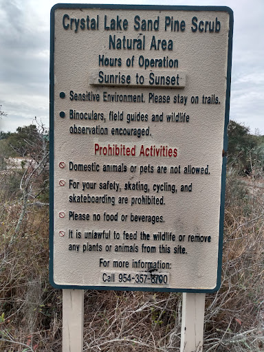 Out looking for a little exercise tonight I found this nice natural area that was first opened to the public in 2002. Located almost directly across from Crystal Lake Middle School I was familiar with this area and never even knew a natural area for hiking was here. I will say upfront there is no crystal lake awaiting you. What you have instead is two trails, the unpaved Sand Pine Trail and the paved Gray Fox Trail, that wind through 24.2 acres of ecologically sensitive scrub pine. Vegetation in this area includes sand pine, scrub oak, saw palmetto, prickly pear cactus, gopher apple, and spike moss. Wildlife that has been spotted in this area include gray fox, five-lined skink, zebra swallowtail butterflies, and protected gopher tortoises. Amenities include a covered shelter, water fountain, signs, benches, and a bike rack. October through May volunteers meet on the fourth Saturday of the month from 9 until 12 to remove invasive species. Other events held her can be found on the board at the start of the trails. Even though I didn't know about this area the parking lot was full when I left on a Sunday evening. It is very rare that I see people at natural areas and this place was an exception. When I turned one corner on the Sand Pine Trail I came upon a large group of people on the benches. I like seeing people who enjoy nature like I do. if you are looking to get out and get moving this place has some great...