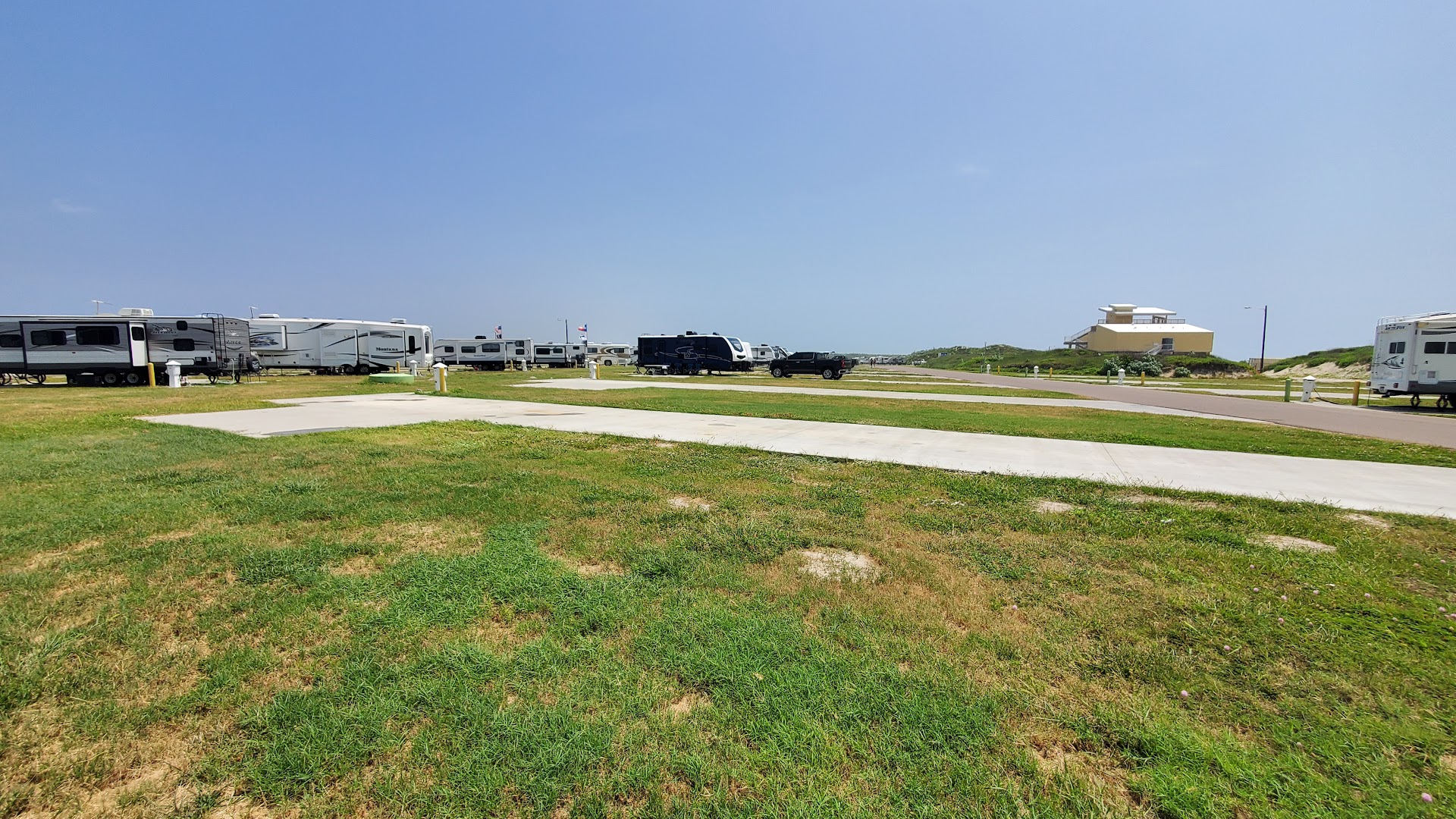 I really like it here! It is clean and peaceful! They have full hookups, with 50amp power, water and sewer connection at every pad site. The water pressure is pretty good (for an RV park), the water pressure is good enough to take a decent shower. The tall dunes help prevent sand from coming into the RV park. The staff is super nice. They are strict with parking, 2 vehicles allowed although I saw one spot with 3 vehicles, so I'm not sure if the office made an exception for them. We were told (by the office) there is a maximum of 8 people per spot. We brought our bbq grill and set it up. The concrete pads are new. The park had a little issue with a few power outages the 2nd day we were here. It may have been due to the extreme heat conditions we had the past few days. It was frustrating as RVs tend to become tin hotboxes. But I saw they installed some plywood to provide shade for the main electrical panels, so hopefully it won't be an issue in the future. So far so good! I see people walking around with their pets. They're remodeling a rec center and beach access so that will be awesome when it's done. It's been a very pleasant experience. Much easier and worth it compared to boondocking on the beach. I did have some issues with calling the office, and so did the other park visitors but leave a message and they will call back. We have a very long RV (see photo), an F350 Truck and another vehicle can still park on our concrete pad. Watch out for stickers in the grass. Another thing worth noting, if they're fully booked, they have a waiting list just in case there are cancelations. I attached a photo with the park rules, but always call for current pricing, as that may change depending on the season. They didn't charge us for any excess electrical or water usage. They don't allow you to wash your vehicles here. They have a dump site here also (for a fee) in case you cannot reserve a pad site, you can at least pay to dump and fill water. I'll try to add a photo of it. I didn't see any showers or laundry room but maybe that will be available when the rec center is completed. There are free showers on the...