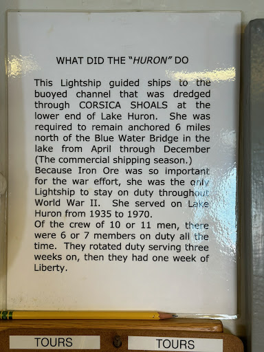 Read moreLove touring the Lightship. Dry docked along St. Clair River in Pine Grove Park. The upper deck offers a beautiful view of the river, Blue Water Bridges, shipping and of course the Canadian border. The ship's ladder/stairs are not handicapped friendly however can be navigated if not too handicapped. There are no bathroom facilities. No wheelchair access. Learn how the Lightship was used in Lake Huron to help with water rescues, navigation and the men whom lived...