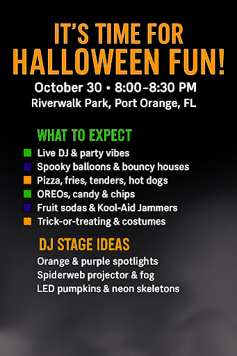 🎃👻 It’s Time for Halloween Fun! 👻🎃 Date & Time: October 30 • 8:00–8:30 PM Location: Riverwalk Park, Port Orange, FL Get ready for an unforgettable Halloween night at Riverwalk Park! It’s Time for Halloween Fun! brings families, friends, and neighbors together for a festive evening filled with spooky delights and lively entertainment. ✨ What to Expect: A live DJ spinning party beats to set the energy Spooky balloons decorating the pavilion & bouncy houses for kids Delicious eats: Little Caesars cheese & pepperoni pizzas 🍕 Fries & chicken tenders from Hip Hop Seafood & Chicken 🍗🍟 Freshly grilled hot dogs 🌭 Sweet treats: OREOs, candy, and chips 🍬🍪 Refreshing drinks: Fruit sodas & Kool-Aid Jammers from the pavilion icebox 🥤 Trick-or-treating & costumes – show off your spooky style! 👻 🎶 DJ Stage Vibes: Orange & purple spotlights, a spiderweb projector with fog, glowing LED pumpkins, and neon skeletons will transform the park into the ultimate Halloween dance zone. This short but magical Halloween celebration is packed with energy, laughter, and community fun. Don’t miss your chance to dance, eat, play, and celebrate under the...