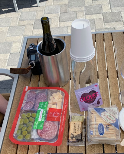 The ”charcuterie board” they handed us was a whole-sale-bought plastic tray of a few slices of salami and cheese and olives – basically a tray of “lunchables” – for $20. The crackers and goat cheese were the same wholesale plastic wrapped thing they hand you. The $4 nuts are what you get free on an airplane. What you see below (without the wine) is about $40 worth of food.