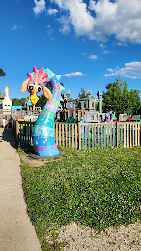 Really nice playground. Restrooms are close to the park. Has covered pavilions and lots of picnic tables. Plus many benches in side the park. It's the nice rubber flooring so easy on the knees if you fall. Has low monkey bars for the real littles to try out and plenty of swings. This park can hold lots of kids without feeling overwhelming. There's only 1 entrance/ exit so it's easy to keep track of your children without worrying they're going to run out. Has a big metal enclosed slide and many smaller slides. Climbing walls, ropes, merry-go-round, sensory toys, music areas and so much more. I highly recommend this park. Parking is right across from the park and close by. Lake Michigan is right next to the park you can see it and feel it if there's a breeze. Pack a coat for early mornings or summer days that don't get too hot. It...