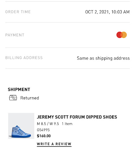 I have never had a bad experience with adidas until yesterday. I called customer service and explained my package had no city how was they gonna mail it. The guy said you can change it through fed ex the package wasnāt mailed out yet. The guy said he canāt change the address the address was correct just no city .I called fed ex they said adidas has a no address change policy . Iām like my package gonna go anywhere and if I donāt receive it you guys keep my money. I called adidas to cancel my order because Iām not taking the chance I was told I had to wait to receive the package . How crazy I looked at my statement they took 129.00 the next day they took out 19.11 they charged the 2 items 129.00 they were 110.00 and 18.99 a piece . The guy on the phone said they take the 129.00 plus they hold 19.11 because the item is shipped out already Iām like what I never heard of no bs like this ever. Mine you the package was 129.00 something total. Why are you holding a extra 19.11 Iām confused you take whatās owed to you . They said itās always been like this mine you I ordered a sweat suit they took the money and that was that . The guy was so rude I couldnāt even talk I had to say this is my money let me speak . Iām done with adidas . Donāt spend your hard earn...