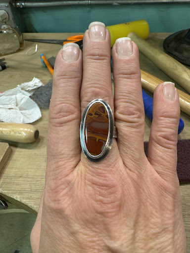 Taking a bezel setting ring making class here was a complete success! Not only was the finished product a success; it was fun, educational and inspiring! Lots of laughs too. The studio set up is great with plenty of well-lit space and the workbenches are fantastic. I was impressed with the air quality being as good as it was too, I'm usually sensitive to chemical smells. Stacey, the teacher/owner has a wonderful calm presence and she did great leading the class and meeting individuals where they were at with their skill set, designs, art, comfort in working with tools, etc. This is totally a beginner-friendly class! The cabochons Stacey had available to choose from had something for everyone, deciding which stone to use was an enjoyable challenge. A friend and I signed up for the class together, which was tons of fun, I highly recommend it! It was the perfect gal-pal date. Get ready to be a hand model, you'll be photographing your ring for the days/weeks following. Warning; after you take one class... you'll be daydreaming of...