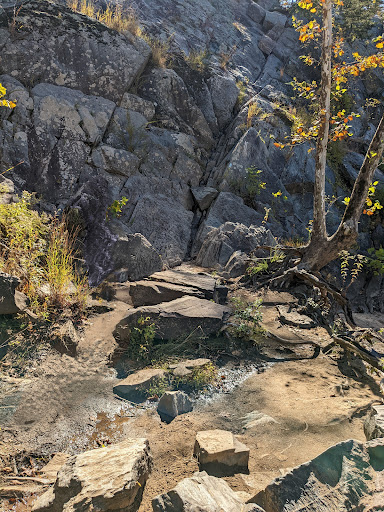 If you're planning on going on the Billy Goat Trail, it's a bit further down the path (you'll see a structure crossing over the trail, it's right before that). I can't emphasize this enough, please make sure you're prepared for this hike before going on it. Don't wear regular tennis shoes if you value your ankles and general well being. This trail is covered in lots of rocks and it is incredibly easy to slip on them if you're not careful. Pets aren't allowed on the trail to protect them and everyone else. Near the end of part of the loop, you come up to a large rock face on the left with the blue blaze going up the rock (picture attached). You're meant to follow the crack along the rock, there are a good amount of hand holds/places for your feet so it shouldn't be an issue if you go slowly and have the right shoes. There is no other way to continue the trail without climbing this ledge, so keep...