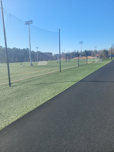 Well-designed West Cobb soccer complex with turf fields and a half mile, soft asphalt track for runners and walkers. Be advised that this is a very popular/busy place with peak times appearing to be early mornings and early evenings. The area is extremely well lit with LED track lighting and stadium-type field lighting. To alleviate safety concerns, Cobb Police patrol the parking lot, the complex is easily visible from and located on a heavily traveled West Cobb road, and there are always lots of people around. Large parking lot, restroom facilities, drinking fountains, daily trash pickup, regular maintenance in natural areas, and "doggie bag" stations are a big plus. Highly recommend to those who want to get in their daily steps.