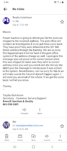 Read morePowell Auction Company was selling multiple lots of 800 silver in their online auction. I won most of the lots including a set of coasters. The lot description says (marked 800) and give a weight of 18oz. As soon as I unpack the set of coasters and see them they are clearly not silver (visually, touch, sound, and the mark all tell someone not silver). Any auction company would know that they weren’t silver. I went back to review all of the auction lots of silver to see if they provided weights and clear pictures of markings for the silver lots and whether or not they provided weights for non-silver items. After comparing all of the lots every silver lot had clear pictures of the marks along with weights. All non-silver lots had pictures of their markings and no weights. LOT # : 76 - SET OF (6) COASTERS - MARKED 800 No pictures of marking provided. Weight of coasters was provided. I request a refund and return this lot. They stated that they are not in the wrong because they never stated they were silver. I asked why even mention they are marked 800 and provide the weight of the items if you know they weren’t silver. This was clear deception to sell fake items and they didn’t provide pictures because everyone would have known they weren’t real. The way they are trying to cover themselves I would also believe that they were the ones bidding the price up knowing these were fake. I was also asked to pay with wire transfer which was new for me with them. I’m assuming so I wouldn’t have any recourse with the situation whether it be a charge back for selling fake items. I always like to get to other professionals options on matters like this before filing claims or writing reviews. I reached out to a few silver collectors and sellers would buy in auctions daily and they too agreed with was clearly deception on their part seeing how they knew they weren’t silver but lead others to believe they were. I reached out one last time sharing the options of the other professionals and that I would be filing with BBB. I don’t see why it is an issue refunding when I spent over $3,000 purchasing all their other...