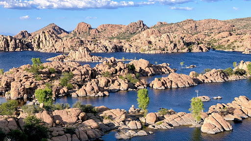 The AllTrails trail head is the main parking lot with the best view of the lake and rocks to clamor on.. if you follow that route clockwise it leads down toward the lower boat launch ramp and parking lot, then into the hills. Bathrooms were adjacent to the trail head, too.