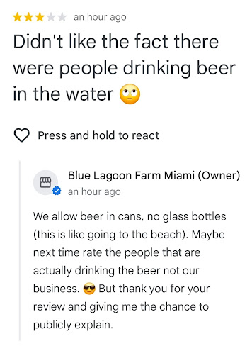 Read moreWay down in Homestead, FL., you’ll find this really cool place called Blue Lagoon Farm (BLF). It’s a five acre tropical escape with a beautiful green lagoon (supposedly spring fed) that was created out of coral rock. Water trickles down the coral rock walls which are covered in natural foliage and the surrounding area offers you different views of this truly scenic gem that the whole family can enjoy. Plenty of shade is provide by the abundance of trees. There are many seating areas ranging in size available around the lagoon. Some of the larger areas have bbq grills. We went to the BLF on a Sunday for a party and it was really nice but hot. The host rented the large tiki hut in the front which was really nice. Another nice feature is that your able to bring your own food & beverages but not glass only cans. It suggested that you rent an area prior to coming to ensure you have a place sit. The kids had a blast swing and floating around the lagoon but the best part was jumping off of various designated jumping areas into the lagoon. Note - there are NO lifeguards which I’m okay with but would suggest keeping an eye on your kids. As you can imagine, if too many kids are jumping off the little cliffs there is bound to be an injury. Also it can become very slippery so bring some good water shoes. The bathrooms were very clean and the staff was very nice & helpful. Apparently there is a small farm on the property not sure if you’re allowed to go see /pet the animals but if the wind blows right the pleasant odor reminds you of their presence. I wanted to ask the owner if the water was checked or treated on a regular basis but it slipped my mind. When I see all those people in that large toilet bowl I can’t help but to think man I hope they check the water. BLF was a great experience and we all had a good time. I think next time if we go I’ll try to go during the week hoping to miss the weekend...