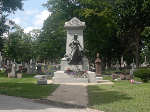 Classic. Beautiful. Evocative. An activist memorial. Bronze figures. A caped, hooded woman with smock, apron. Fierce grim determination on her face. Intense. Fixed gaze. Right arm across her chest. As if hand on sword, ready to defend herself. Fight. An active not passive female flgure. Never looking away, ever vigilant as she holds in her left hand a laurel wreath held above her fallen comrade, a reclining male figure in overalls. No longer present: The flowing black metal woven wreath of flower stems and leaves across its base just above its portentous inscription. An extremely formidable memorial. Not just figures or frequently quoted words. The movement of the statue itself. Gradually from a strong base. Progressively. In tiers. Sixteen feet of granite. A triangular cap. Pointing ever upward. Ever forward. Beautifully designed by Albert Weinert in 1893. Funded by an anarchist coalition, the Pioneer Aid and Support Organization, headed by Lucy Parsons, wife of Albert R. Parsons. Thought inspired by sentiment from the Marseillaise, as 'Warrior sons cut down by mercenary phalanxes'. On the back plaque: 'Vile chains' - shown broken. Spiny acanthus leaves on either side. Ceremonial black. Inscribed with the words of the pardon from the Illinois governor. At a nearby raised plaque the names of those seen as unfairly jailed. Sentenced. Executed by hanging or dead by another means. Declared a national historic monument 1997: "Represents the labor movements struggle for workers rights and possesses national significance in commemorating the history of the USA." Those convicted. Not just interested in an eight hour day. A higher living wage. Passionate socialists committed to ending capitalism. Radical social restructuring. Articulate anarchist leaders. Staff of the radical German anarchist newspaper. Bomb makers. Some who would rather die than admit guilt and plea for clemency. Vehemently opposed to social injustice, class exploitation of the workers. At the time anarchy a modified socialist reactive posturing; defensive preparation in case of violence, explosives, guns in readiness for the revolution. Not the black flag as it has become. Yet part of the labor movement and its unions. Waldheim, formed by German masonic lodges, was the only cemetery that would accept their remains. It was frequently used by immigrants, as it did not discriminate by religion or ethnicity. Later it merged with Forest Home. This is now maintained by the ILHS. Over 8000 attended its dedication. International representation. Flags from European Unions and American groups. Martyrdom is born of fervor. As a religious passion of self-sacrifice to advance a cause, against an intractable oppression. If only in men's hearts. When meaningful dialogue and constructive solutions fail, that hatred, rigidity - on any side- would impel violent action as a last resort, is tragic. I pray that compassion, understanding and reason guide men's souls and illuminate their minds for a...