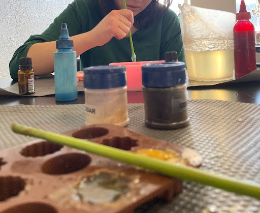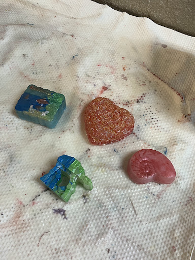 The process is as follows: You enter the shop, pick out the molds you want for your soap Pick out the scent(s) you want included in your soap Walk to the back area with tables (the worker will have set up a table for you) and pick out any mix-ins you want and the colors you want for your soap The employee will bring out the melted soap you pour the soap into your mold, add the mix-ins, color, and scent Stir the soap to mix it all thoroughly The worker will take your soap back to soak it in an ice bath The worker will bring the soap back out and you can paint it if you wish The worker will spray a sealant on your soap to help the paint stick and once that dries, you can pay and leave.