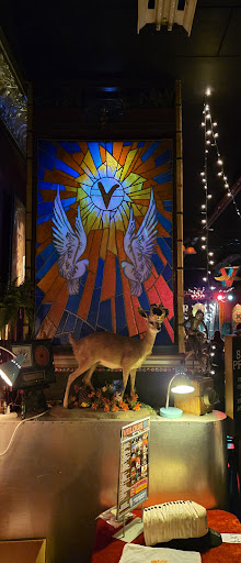 Inside the venue is like entering one of the neighboring antique shops. There are all sorts of amazing antiques you could stare at for hours and wonder what each one's story is. My favorites were the massive bison head, the old Pepsi mural that is half gone on the now exposed brick wall, and the old child's bike they've managed to cast a shadow of on the wall.
