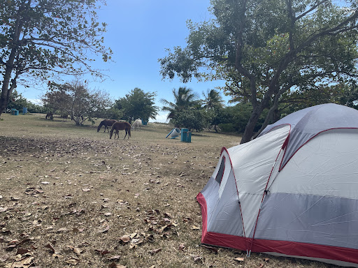 Camped in the section of grass meant for camping. You can tell it was really amazing in the past. We were the only ones there but we did notice other campers closer to the beach, hidden in the trees. Ants and mosquitoes are manageable if could handle a few bites. Showers work and the water is drinkable. Beware the horses are very thirsty and wait by the showers for someone to turn them on. I did this and was crowded out by all the horses. Unfortunately as much as I want to help them with their thirst, they became very aggressive with each other and began slipping on the tile. There’s another small silver shower on the side of the campsite that they didn’t notice so we began to use those showers. Restrooms open all night. There is a security guard there who welcomed us...