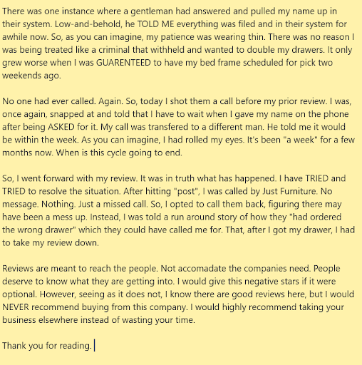 As of 5/28/2019 at 6:40PM, Just Furniture called to tell me to take my review down upon getting my drawer in a few days. This is ALSO the very first time they have reached out to call me directly. As I have always been in contact with them. They do not leave voicemail messages either.