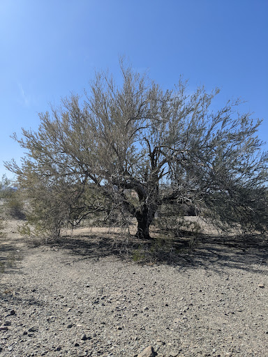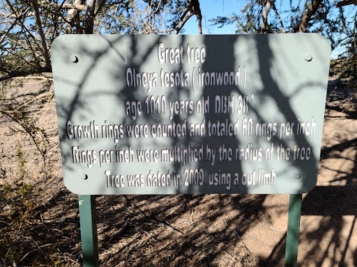 A fairly reverent place, a worthy tree for honor. There are several other large desert ironwood trees in the immediate area, which must be hundreds of years old themselves. The rock-lined path leading to the tree is loose gravel, and the 50 feet across the wash to the tree might be...