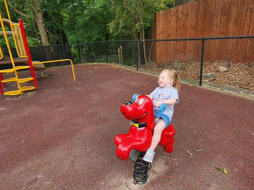 Too close to the road with no gate for small children. If you have small children or a child developmental delays this park may not be suitable for them. The equipment is nice and this area needs more little community playgrounds like this however it sits very close to the road. I understand that the location can't always be helped but they could easily install a self closing gate to prevent small children from darting into the road. The side of the park that faces Stuart Dr is a little safer because of the retaining wall and stairs but the opening in the fence on the Longstreet Dr side is steps from the base of a slide and a child could easily be in the road within seconds of leaving the park. Young kids aren't always safety conscience when running and playing and can forget to check their surroundings. If they can be off of playground equipment and in the street within 10 steps that's dangerous.