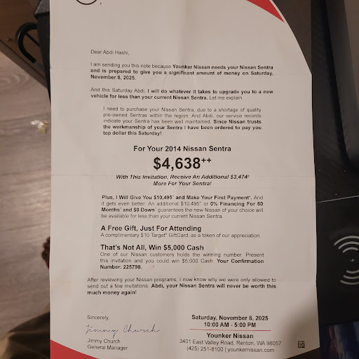 I purchased a used car from Younker Nissan back in February after getting into a car accident. I was really desperate for a car and was hoping to purchase something within budget so I wouldn't have to finance. Stephan was the salesperson who helped me out and seemed to genuinely care about my situation and wanted to provide me with a car I truly liked and felt safe in. The sales portion of the vehicle went very smoothly. However, my reason for the 3 stars is because of a lack of communication and follow through.
