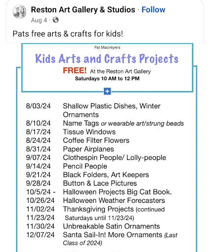 Read moreThe Reston Art Gallery and Studios is a small privately owned cooperative gallery in the historical Lake Anne area of Reston. Come see gallery artists working on the weekends. Free Childress arts and Crafts projects are offered on Saturday mornings from 10 to 12. Open weekends or by appointment. See us on Facebook for more...