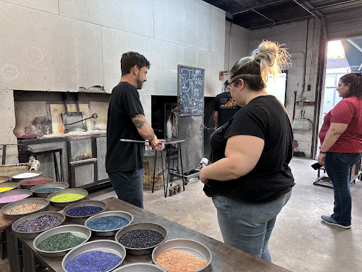 There were sixteen glass colors to choose from and you can pick up to two colors. We made glasses and there were three basic designs that could be customized to what we liked. Pint glass, whiskey or wine glass.